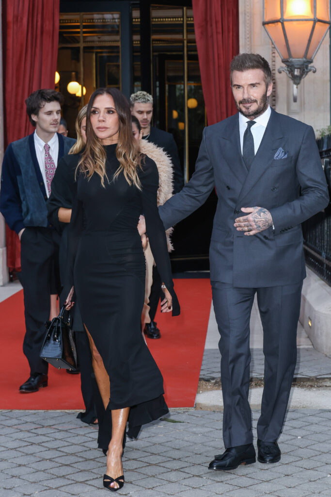 U crnoj haljini sa visokim ovratnikom i impresivnim prorezom, Victoria je prošetala kroz francusku prestonicu, u špicastim crnim cipelama, dok joj je muž, David Beckham, stajao uz bok. Fudbalska legenda bio je elegantan u odelu sivo-plave boje, sa kravatom, belom košuljom i sjajnim crnim cipelama.