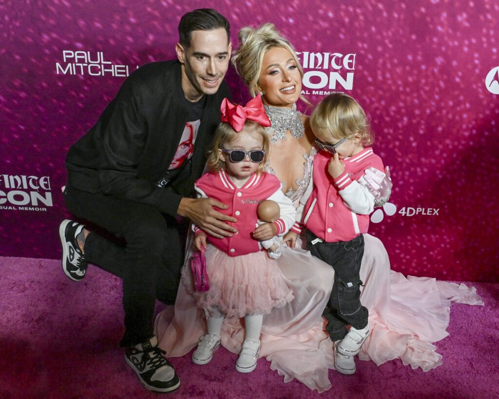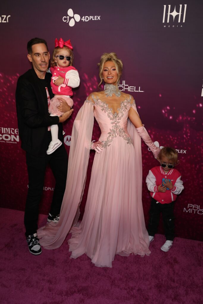 Međutim, Hilton nije bila jedina koja je privukla pažnju na crvenom tepihu. Njeno dvoje mališana ukralo je deo reflektora u identičnim jarko-ružičastim varsity jaknama, izvezenim njihovim imenima.