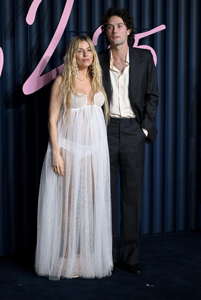 Sienna je na dodelu došla sa partnerom, glumcem i modelom Olijem Grinom, sa kojim već ima ćerku. Za ovu priliku, 43-godišnja Miler odabrala je dugu prozirnu belu haljinu kuće Givenchy, koja je nenametljivo istakla njen trudnički stomačić – savršen prikaz njenog omiljenog stila. Kosu je nosila puštenu u talasima boje peščane plave, u kombinaciji sa velikim luster-minđušama i metalik noktima.