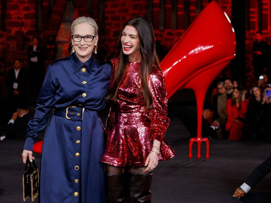Streep je, s druge strane, u potpunosti prigrlila svoju unutrašnju Mirandu Priestly. Možda se sećate crvene cipele sa postera originalnog filma The Devil Wears Prada, gde je štikla bila zamenjena vilama. Ovoga puta, dobitnica Oskara odala je počast toj kultnoj slici ne samo noseći jarko crvene cipele sa otvorenom petom, već i birajući potpuno monohromatski izgled — bluzu sa mašnom oko vrata, jednoredni sako i pantalone širokih nogavica Dolce&Gabbana, sve u istoj nijansi crvene. Kombinaciju je upotpunila naočarima mačkastog oblika u boji brusnice i zlatnim karika minđušama brenda Fope.