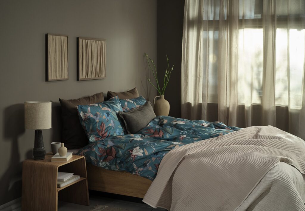 BERTHA – 100% pamučni saten cvetnog uzorka u prirodnim tonovima koji unosi malo egzotike u mirnu i opuštajuću atmosferu.
