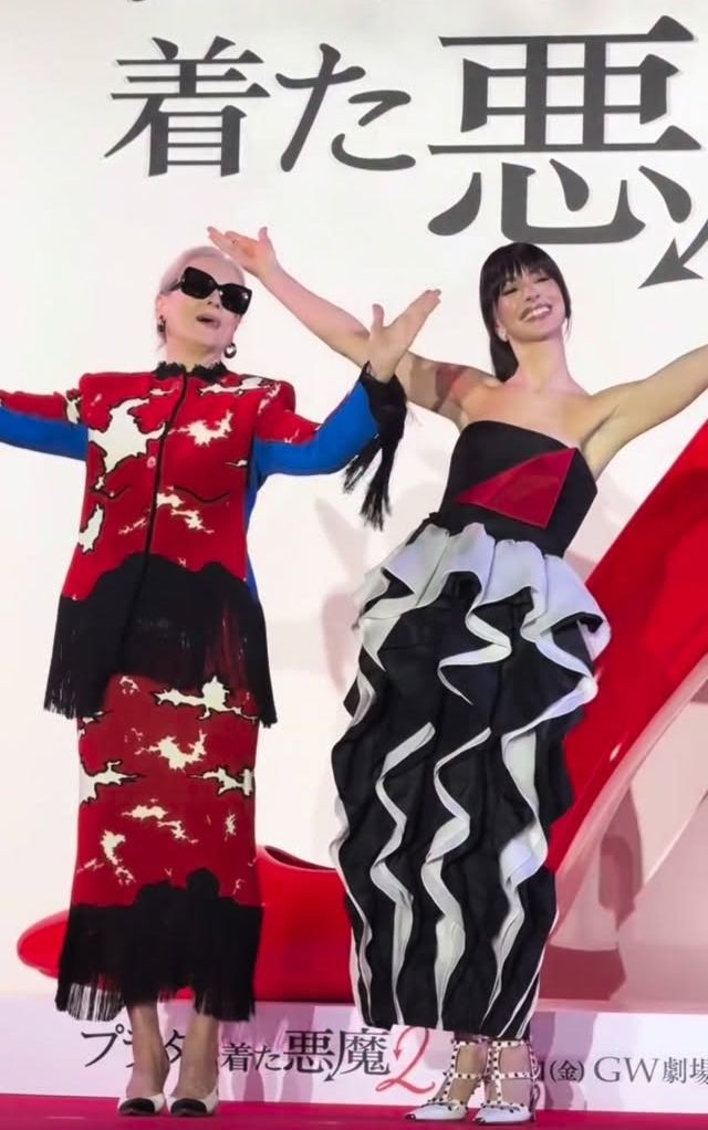 Na fan događaju u japanskoj prestonici, Streep — koju publika obožava kao nemilosrdnu, ali besprekorno stilizovanu Mirandu Priestly — nosila je komplet iz Métiers d’Art Pre-Fall 2026 kolekcije. U pitanju je kaput i midi suknja u vibrantnoj vermilion nijansi, ukrašeni grafičkim belim šarama koje podsećaju na pukotine, dok crni resasti detalji duž rukava i ivica donose suptilan western vajb.