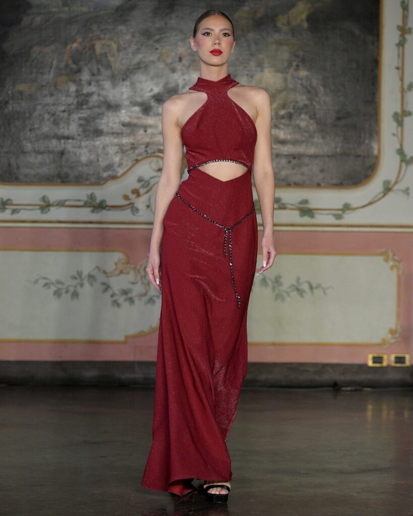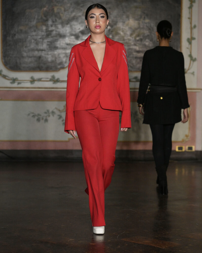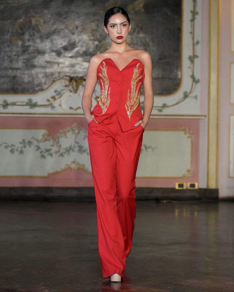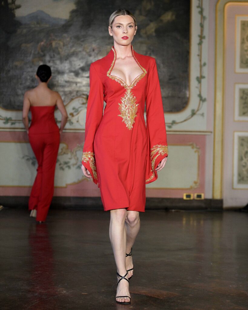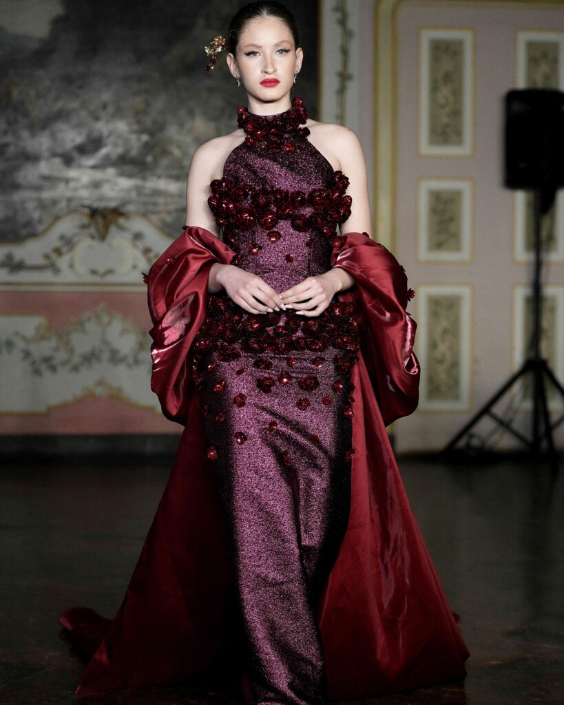 House of Rina predstavio je kolekciju Le Donne Di Rosso, posvetu ženama širom sveta — slaveći njihovu hrabrost, otpornost i transformativnu snagu. Više od modne prezentacije, revija se razvijala kao emotivno putovanje koje je oslikalo slojevitu prirodu savremene ženstvenosti, gde nežnost i snaga postoje u savršenoj ravnoteži. Promišljen dijalog između senke i vatre definisao je paletu: duboka crna čipka, šifon, saten i baršun govorili su o neispričanim pričama i unutrašnjoj snazi oblikovanoj iskustvom, dok su siluete u prkosnoj crvenoj charmeuse svili, organzi, georgetteu i lepršavoj svili postale kolektivni glas vidljivosti i solidarnosti. Crvena je pulsirala životom i svrhom, simbolizujući hrabrost i neraskidivu vezu između žena koje se uzdižu zajedno. Diskretni kristalni i biserni detalji naglasili su preciznost couture izrade, dok je kontrast između strukturisanog baršuna i bestežinskog šifona odražavao ranjivost i snagu koje koegzistiraju unutar jedne snažne vizije.