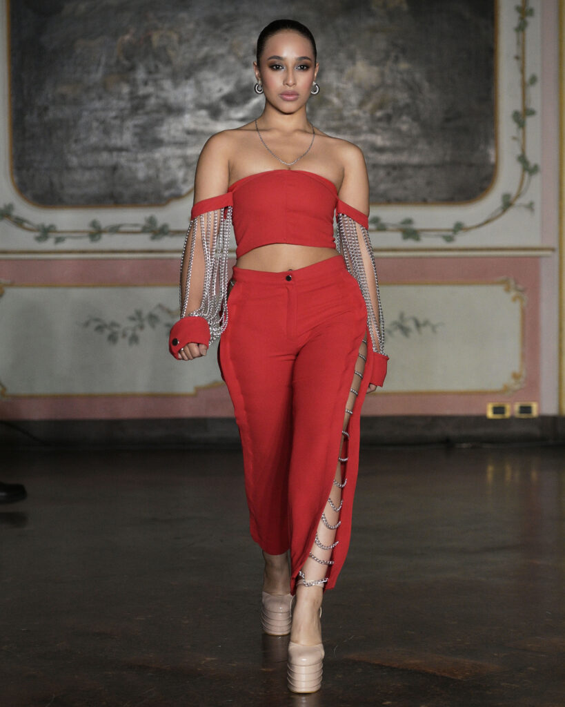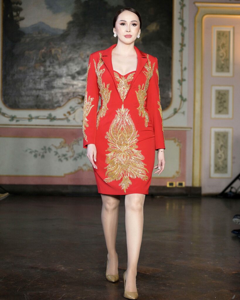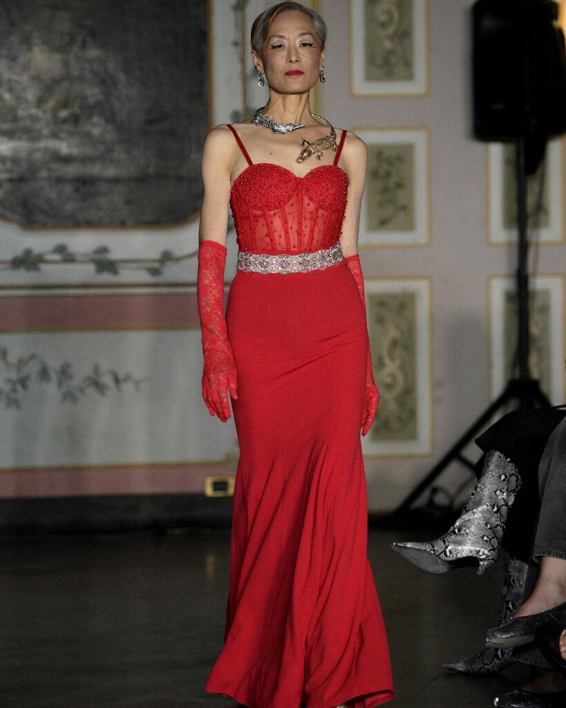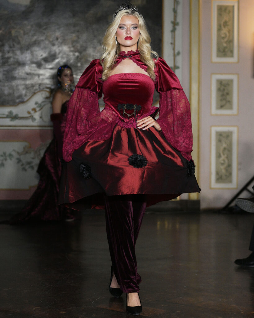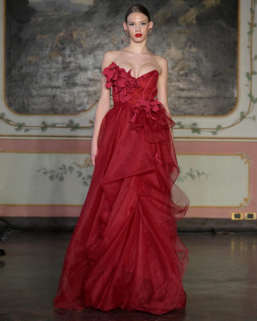 House of Rina predstavio je kolekciju Le Donne Di Rosso, posvetu ženama širom sveta — slaveći njihovu hrabrost, otpornost i transformativnu snagu. Više od modne prezentacije, revija se razvijala kao emotivno putovanje koje je oslikalo slojevitu prirodu savremene ženstvenosti, gde nežnost i snaga postoje u savršenoj ravnoteži. Promišljen dijalog između senke i vatre definisao je paletu: duboka crna čipka, šifon, saten i baršun govorili su o neispričanim pričama i unutrašnjoj snazi oblikovanoj iskustvom, dok su siluete u prkosnoj crvenoj charmeuse svili, organzi, georgetteu i lepršavoj svili postale kolektivni glas vidljivosti i solidarnosti. Crvena je pulsirala životom i svrhom, simbolizujući hrabrost i neraskidivu vezu između žena koje se uzdižu zajedno. Diskretni kristalni i biserni detalji naglasili su preciznost couture izrade, dok je kontrast između strukturisanog baršuna i bestežinskog šifona odražavao ranjivost i snagu koje koegzistiraju unutar jedne snažne vizije.