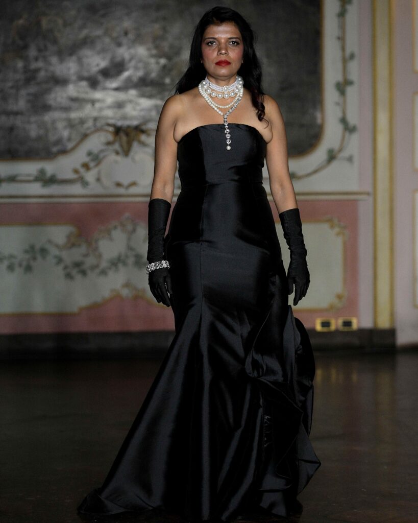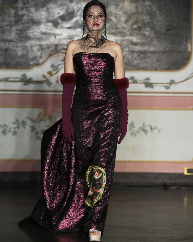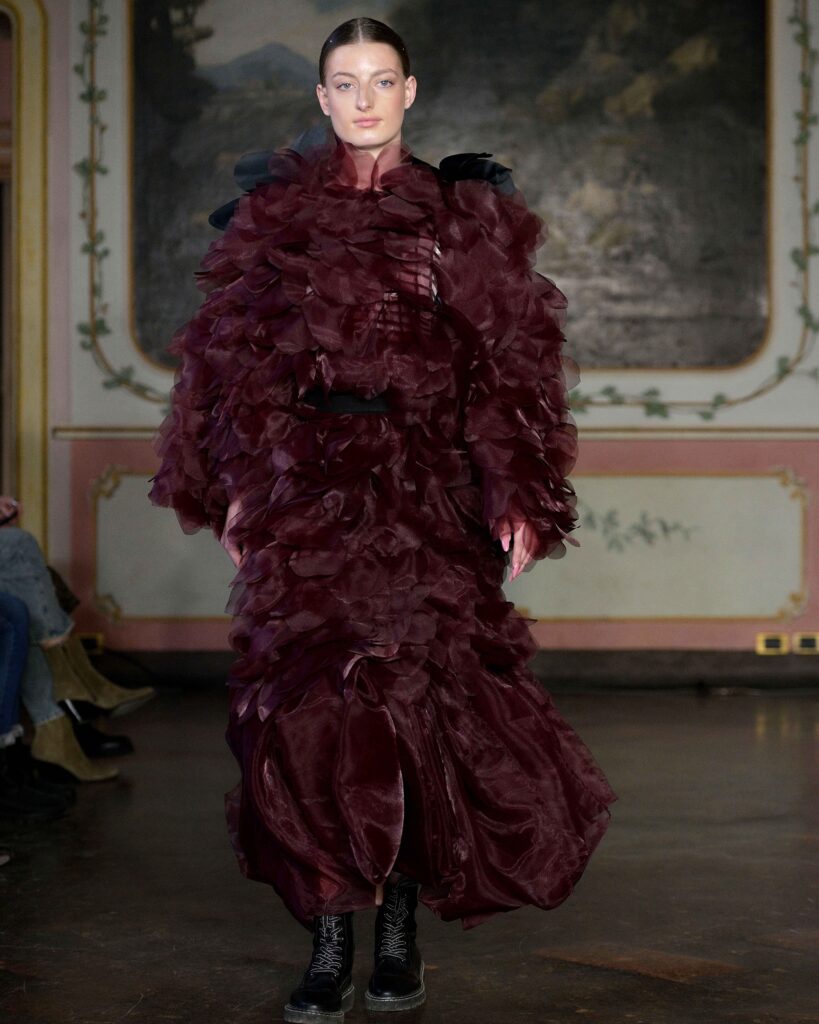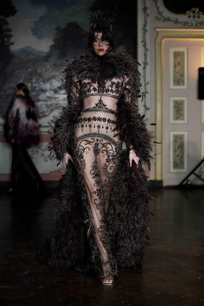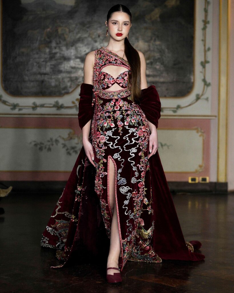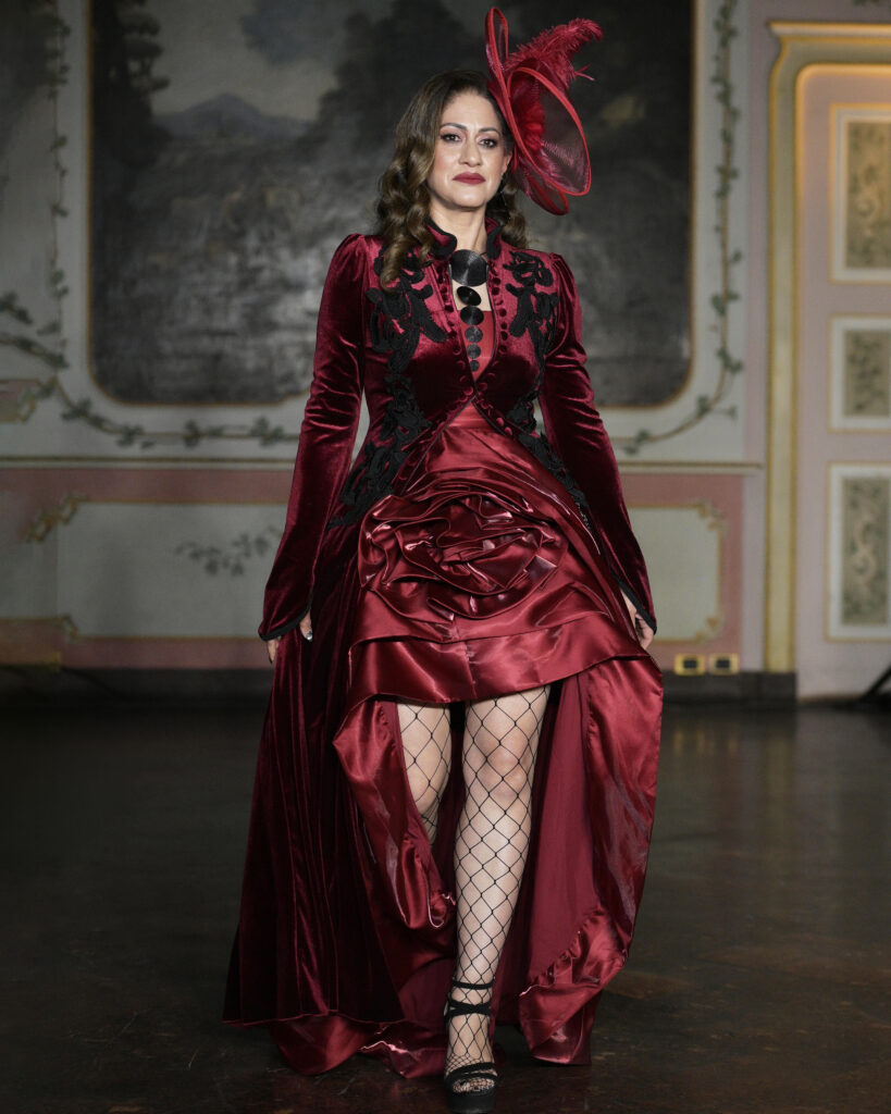 Paroma-Àla-Mode, brend koji je osnovala Paromita Ghosh, predstavio je duboko ličnu couture izjavu u kojoj se susreću nasleđe, ženstvenost i teatralna elegancija. Kolekcija je oblikovana u dramatičnoj paleti bordo i crne boje, kroz skulpturalne baršunaste siluete, fluidno drapiranje i složene dekorativne detalje koji su spajali senzualnost i snagu. Upadljivi šeširi, korsetske konstrukcije i slojevite teksture uneli su duh modernog vintage glamura.