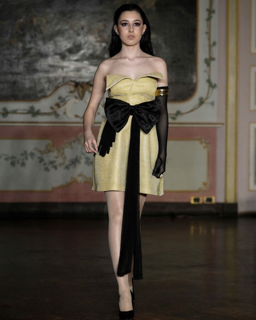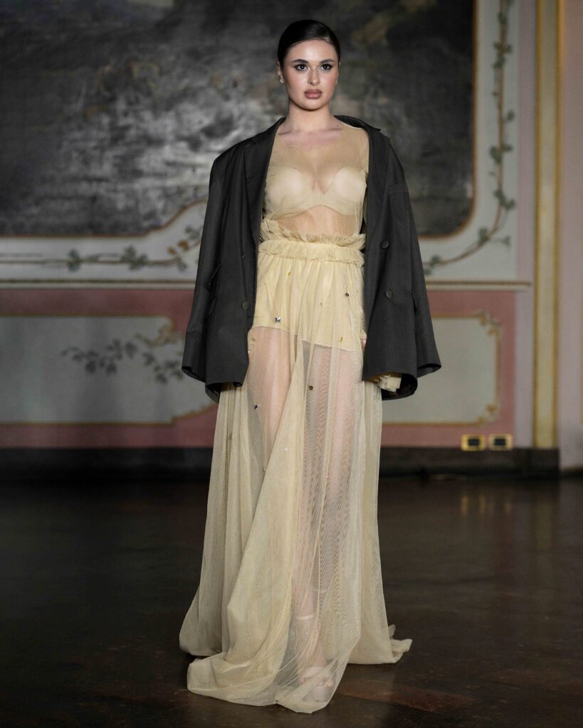 Ia Goniadze predstavila je viziju moderne visoke mode zasnovanu na filozofiji ekskluzivnosti i bezvremenske sofisticiranosti. Rafinirana paleta prigušenog zlata i crne uokvirila je kolekciju, dok su korsetski strukovi, arhitektonske karneri i prozirni, gotovo bestežinski slojevi stvorili dijalog između strukture i fluidnosti. Ručno izrađeni tekstili i pažljivo konstruisane siluete naglasili su posvećenost modne kuće individualnosti — svaki izgled postoji kao jedinstveno delo, a ne kao ponovljiv dizajn. Balansirajući između klasične elegancije i izrazito modernog senzibiliteta, kolekcija je utelovila tihi, samouvereni luksuz i potvrdila dugogodišnju filozofiju Ia Goniadze da prava visoka moda počinje tamo gde jedinstvenost postaje apsolutna.