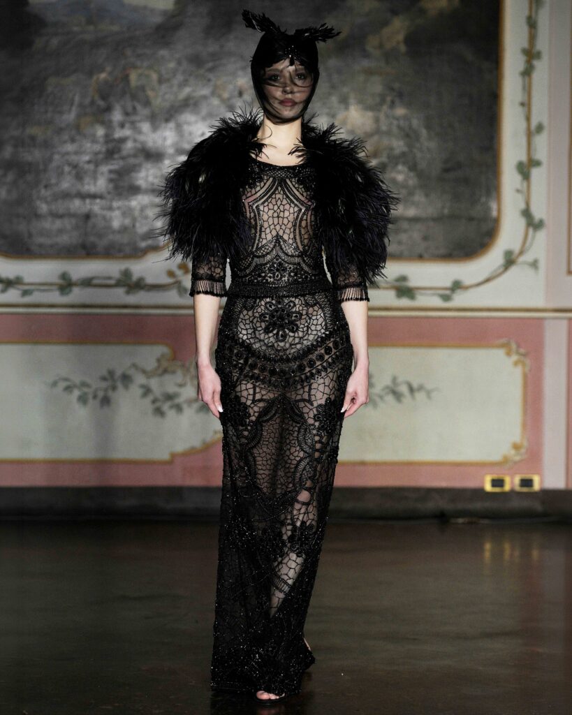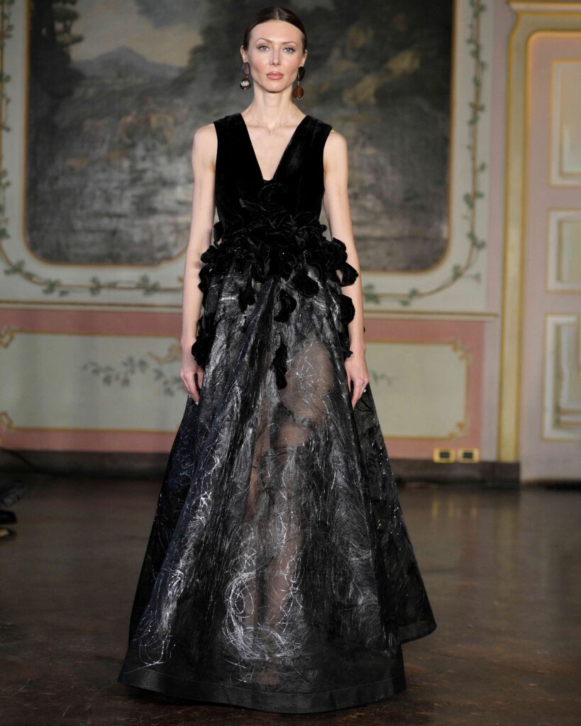 Ia Goniadze presented a vision of modern couture rooted in the philosophy of exclusivity and timeless refinement. A refined palette of muted gold and black framed the collection, while corseted waists, architectural ruffles, and sheer, weightless layers created a dialogue between structure and fluidity. Handcrafted textiles and meticulously constructed silhouettes highlighted the house’s devotion to individuality — each look existing as a singular work rather than a repeatable design. Balancing classic elegance with a distinctly modern edge, the collection embodied a quiet, confident luxury, reaffirming Ia Goniadze’s long-standing philosophy that true couture begins where uniqueness becomes absolute.