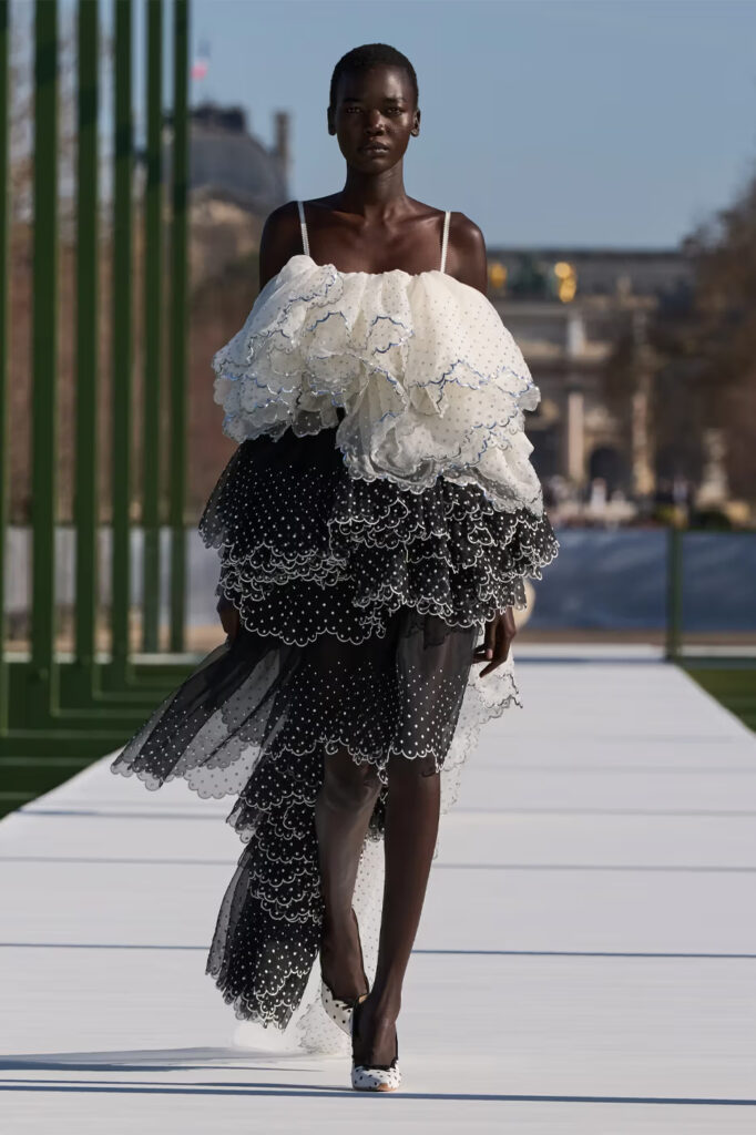 Nadovezujući se na svoju januarsku visoku modu sa motivima vrta, Anderson je spojio cvetne i vodene elemente sa veštinom koja bi i samog Claudea Moneta učinila ponosnim. Prvi model bila je pufnasta mini-suknja sa dugim, gotovo meduzolikim šlepom, nošena uz svetlucavi kardigan sa diskretnim peplumom. Da, Anderson je vratio estetiku 2010-ih, zajedno sa volanima i slojevima, kroz čitavu kolekciju (iako nije otišao do punog osamnaestovekovnog paniers efekta kao prošle sezone). Poigrao se i kodovima kuće, prikazavši skraćenu verziju čuvene Bar jakne, često kombinovanu sa bogato naboranom suknjom. U mnogim kombinacijama gornji deo bio je uzdržan, dok je donji bio romantičan — nagoveštavajući da se, kao i kod cvetova, ispod površine krije mnogo više.
