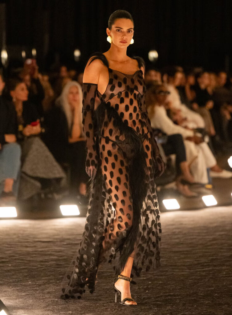 Kylie Jenner, sa druge strane, svojim prisustvom i podrškom naglasila je glamur i ekskluzivnost revije. Haljina koju je nosila, imala je dubok dekolte i asimetričnu suknju sa volanima, dok su metalni lanci bili ukrašeni srebrnim resicama koje su se kretale sa svakim njenim korakom, stvarajući efekat svetlucanja.