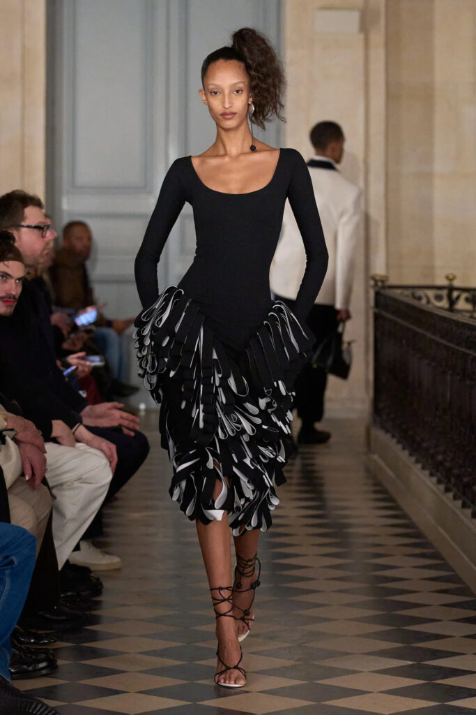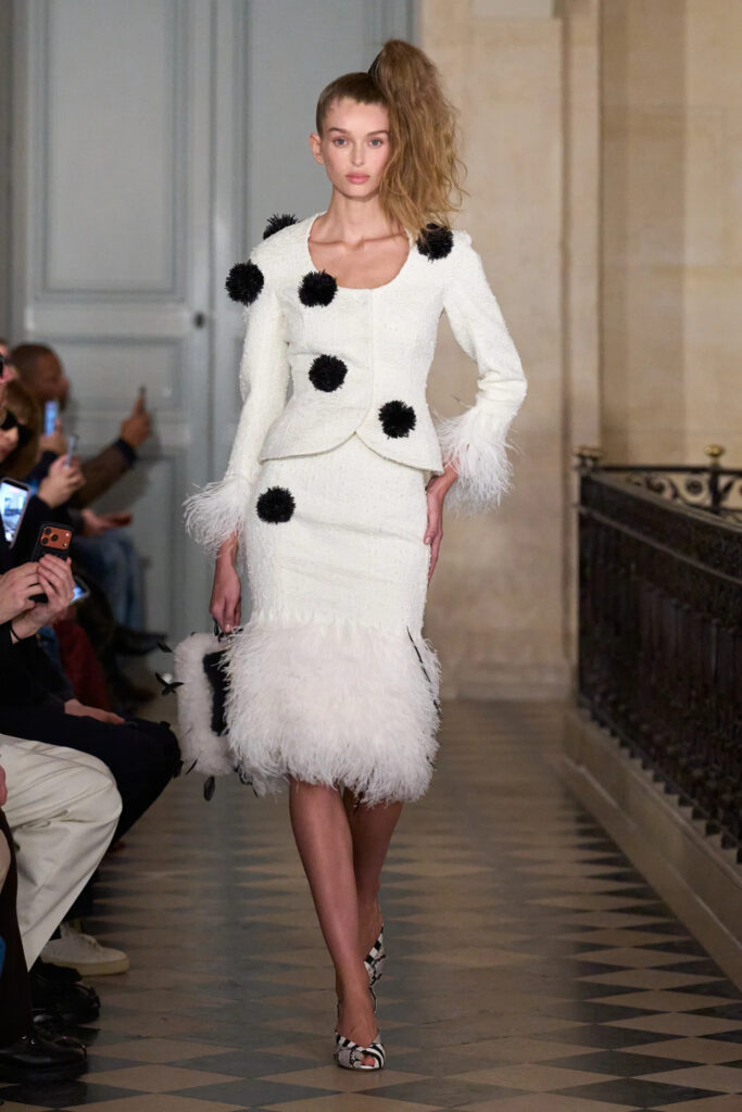 Silueta je bila temelj kolekcije, oslonjena na precizan midi kroj. Sakoi su se elegantno sužavali u struku, ramena su se otvarala kroz raglan linije, dok su se suknje blago širile iz strukturisanog dela u predelu struka koje su uokvirivale kukove. Ekstravagantni šeširi unosili su dozu teatralnosti, ali su komadi zadržali jasnoću kroz pripijene pletenine i fluidne haljine koje su pratile telo sa nenametljivom, gotovo prirodnom zavodljivošću. Baršunasta intarzija, smeli tufnasti motivi, pletenina u nijansi puter-žute i rese u petljama davali su kolekciji bogatu, izražajnu teksturu.