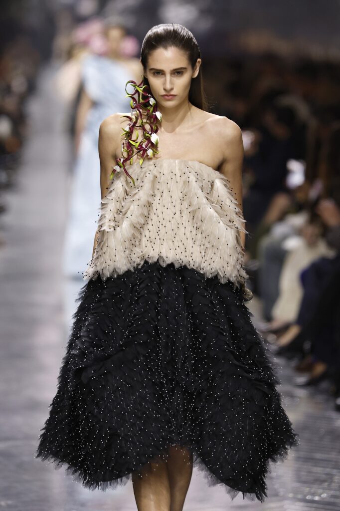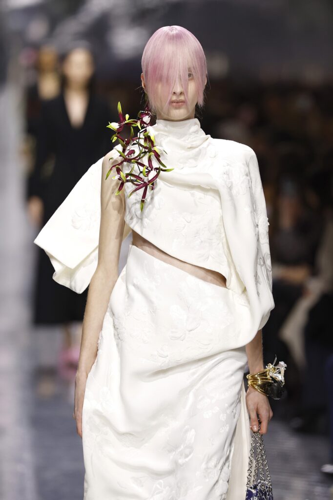 Na debiju haute couture kolekcije Christiana Diora za proleće 2026. godine, Jonathan Anderson je modnu pistu pretvorio u cvetnu oazu. Ceo plafon šatora za reviju bio je prekriven malim pupoljcima u nežno ružičastoj i beloj nijansi – dok su iste cvetne note krunisale modele kroz aksesoar koji je osmislio Stephen Jones, podsećajući na slušalice ili ušnu oblogu, i inspirisale tonove svežeg, svetlucavog mejkapa.